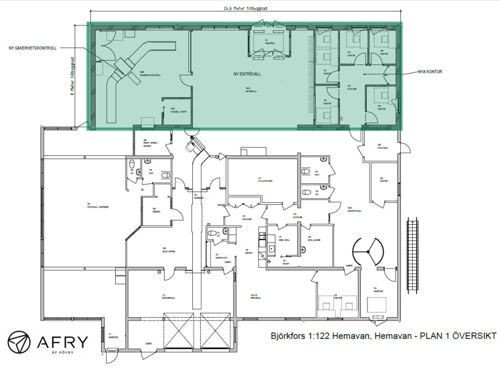 Utbyggnaden kommer rymma en ny säkerhetskontroll som förenklar proceduren för både passagerare och personal. Den kommer kännas luftigare, effektivare och säkrare. I den kombinerade entrén och incheckning kommer det också kännas betydligt rymligare och trevligare. Utbyggnaden innebär att flera av våra nuvarande kontorsplatser försvinner. Den nya delen kommer därför även inrymma en del kontorsytor. Nedan (grönmarkerat)ser du ytorna som tillkommer i utbyggnaden!